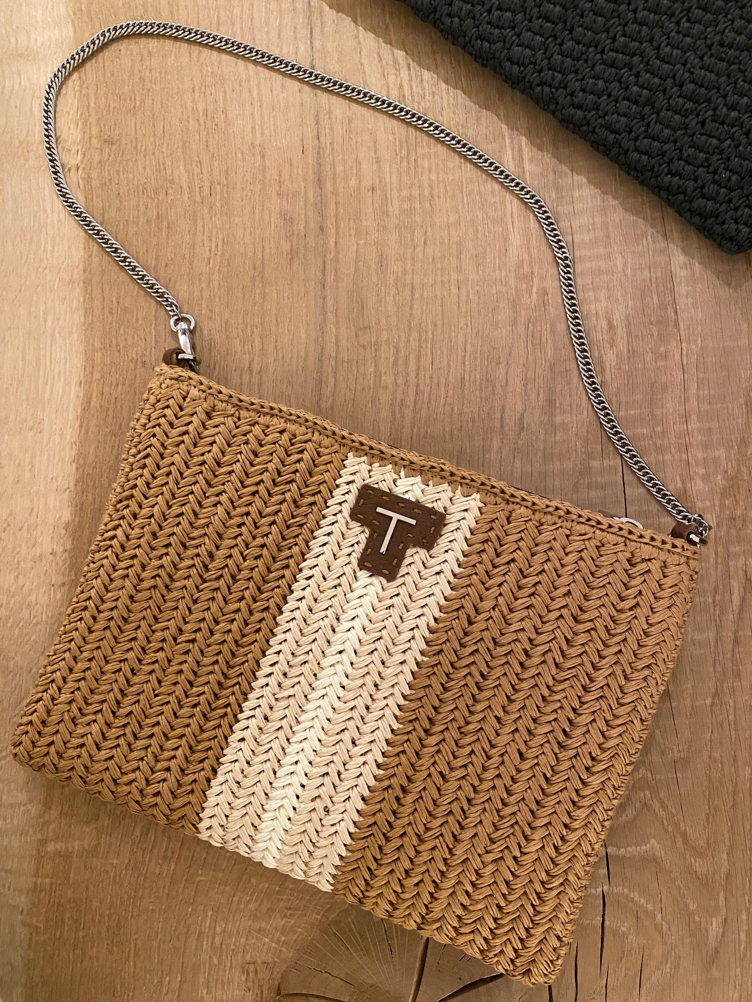 Bolso 100 % tejido y confeccionado a mano, usando materiales ecológicos que respetan el medio ambiente. 100 % hilo de papel de rafia. 100 % piel natural